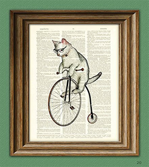 This print features a cat wearing glasses and riding a penny farthing, all on an old dictionary page, making it a unique gift for your favorite crazy cat gentleman.