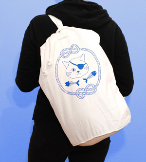 This 100% cotton duffle bag is hand screen printed with an original image of a pirate cat, making it a fun gift for men who love kitties.