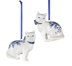 Set of Two Porcelain Delft Blue Cat Ornaments