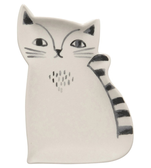 This trinket tray looks like a black and white cat, it’s made from ceramic, and it can be used to hold lots of different items.