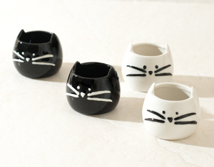 This set of four ceramic cat shot glasses features two white glasses and two black glasses, and each shot glass holds 1.75 ounces.