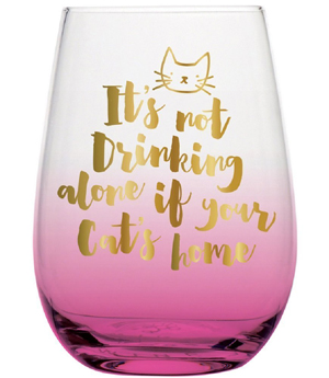 This stemless wine glass is for cat ladies who also like wine, and it holds 18 ounces and features gold lettering.