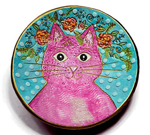 This ring dish features a beautiful pink cat and lots of flowers, it’s hand-painted, and it’s made from polymer clay.