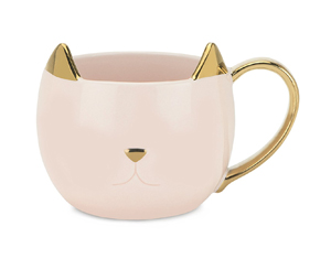 This pink mug looks like a cute cat face, it features gold accents, it’s made from ceramic, and it holds 12 ounces.