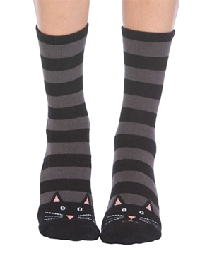 These black and grey slipper socks feature cute black cat faces, they have non-slip soles, and one size fits all.
