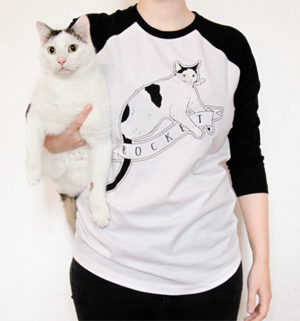 This baseball t-shirt is hand screen printed with an original image of Rocket, an adorable two-legged cat, and this shirt is made from 100% cotton and comes in a range of sizes.