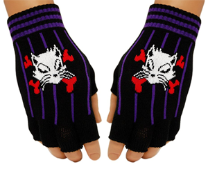 These purple and white fingerless gloves feature a white cat as a skull and crossbones, and one size fits most.