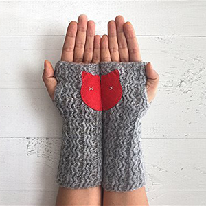 These gloves are handmade, and they feature a cute red cat made from felt on a grey knitted background.
