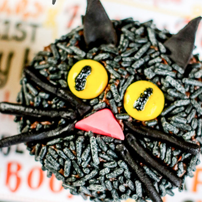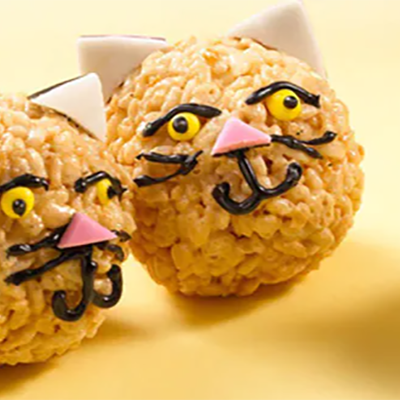 These Halloween treats look like cats, and to make them you’ll need Rice Krispies cereal, vanilla extract, marshmallows, black icing, and more.
