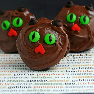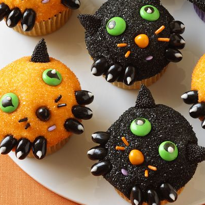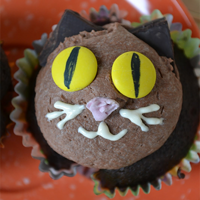 These chocolate cupcakes look like black cats, and to make a batch for Halloween, you will need vegetable shortening, cocoa powder, powdered sugar, vegetable oil, vinegar, and more.