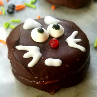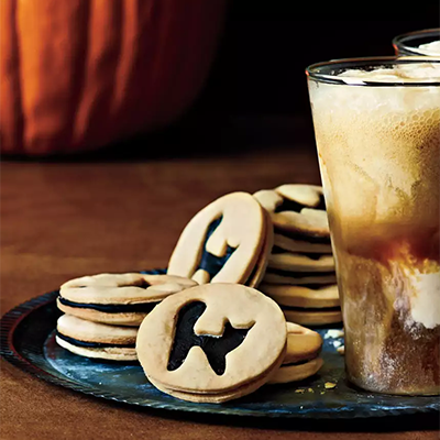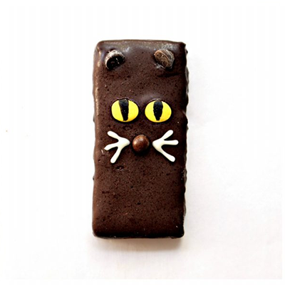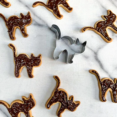 These Halloween cookies feature black cats, and to make a batch or two, you’ll need Dutch process cocoa, bittersweet chocolate, powdered sugar, cake flour, a round cookie cutter, and more.