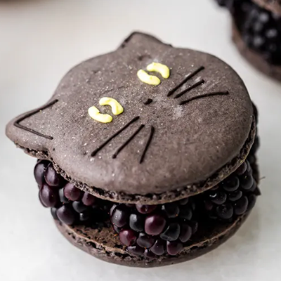 Thes blackberry macarons look like black cats, so they’re perfect for Halloween, and to make them you will need piping bags, black gel food coloring, dark chocolate, edible gold luster dust, almond meal, and more.