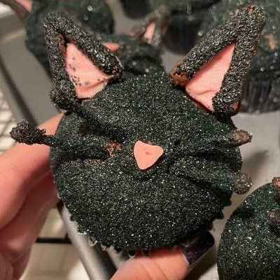 These Halloween double chocolate cupcakes look like black cats, and if you want to make them, you will need black cocoa powder, black sanding sugar, dark chocolate chips, vegetable oil, espresso powder, pink candy melts, and more.