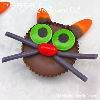 These simple Halloween treats look like black cats, and to make them you will need Reese’s Peanut Butter Cups, green candy eyeballs, chocolate frosting, candy corn, and more.