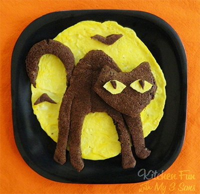 If you want to make this spooky black cat breakfast for Halloween morning, you will need pancake mix, eggs, cocoa powder, kitchen scissors, and more.