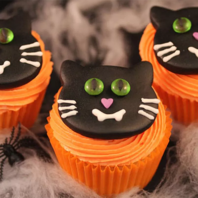 These cupcakes feature cute black vampire cats, and if you want to make a batch of them this Halloween, you will need black fondant, orange food coloring paste, a silicone mat, purple heart sprinkles, a piping bag, a cat cookie cutter, and more.