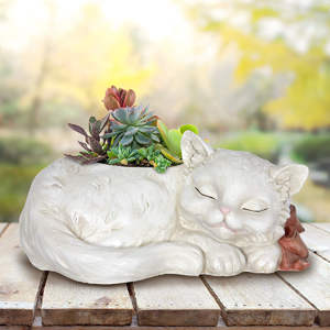 This adorable planter features a cute cat and it’s made from weatherproof polymer that looks like stone, making it ideal for outdoor plants and flowers.