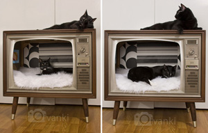 You can turn a vintage television into a retro cat bed simply by gutting the TV and adding some funky wallpaper and a fuzzy piece of faux fur.