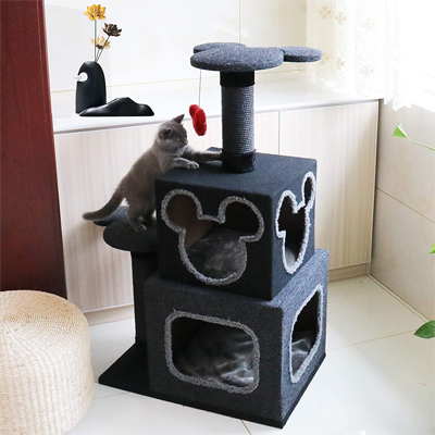 This cat tree features a fun design inspired by Disney, and it features two retreat areas, two resting platforms, and two red Mickey Mouse swatting toys.